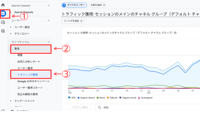 メニューから「レポート」→「集客」→「トラフィック獲得」をクリックします。