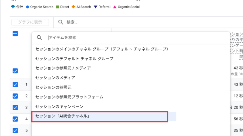 Google Analytics には、もともと「検索」「SNS」「直接(ブックマークなど)」といった分類がありますが、「AIからの流入」という項目はまだ用意されていません。