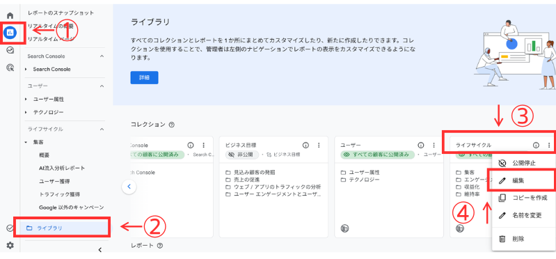 「コレクション」の中にある「ライフサイクル」の右端にある「︙(三点メニュー)」をクリックし、「編集」を選択します。