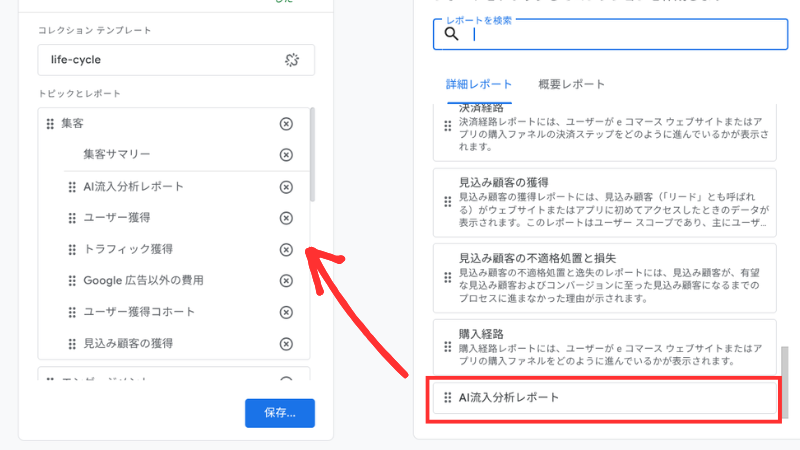 一覧の中に、先ほど作成した「AI流入分析レポート」があるので、これをドラッグして「ライフサイクル」に追加します。(※表示されていない場合は、少し下にスクロールして探してみてください)