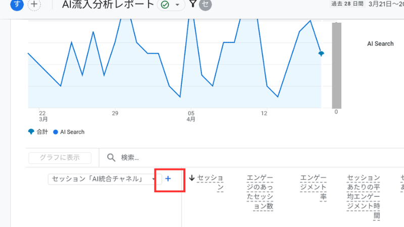 「AI流入分析レポート」の表の中にある「+(ディメンション追加)」をクリックします。