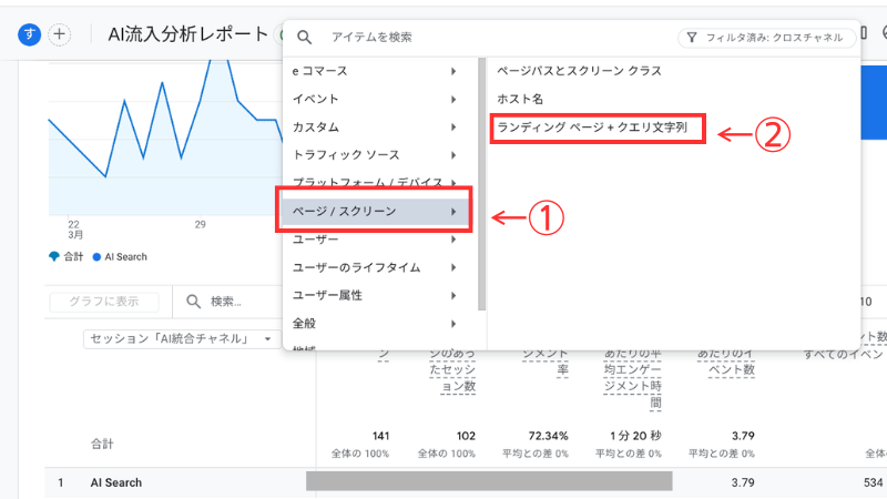 これで、AIから流入したユーザーが最初に訪れたページ(=ランディングページ)が表示されます。