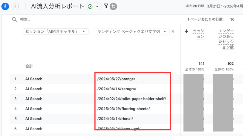実際に設定してみて分かったのは、通常の検索流入では古めの記事がヒットしやすいのに対し、AIからの流入では比較的新しい記事も多く見られたことです。