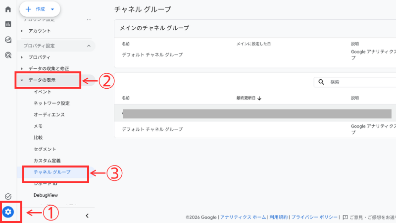 画面左下の ⚙[管理] > [データの表示] > [チャネルグループ] をクリックします。