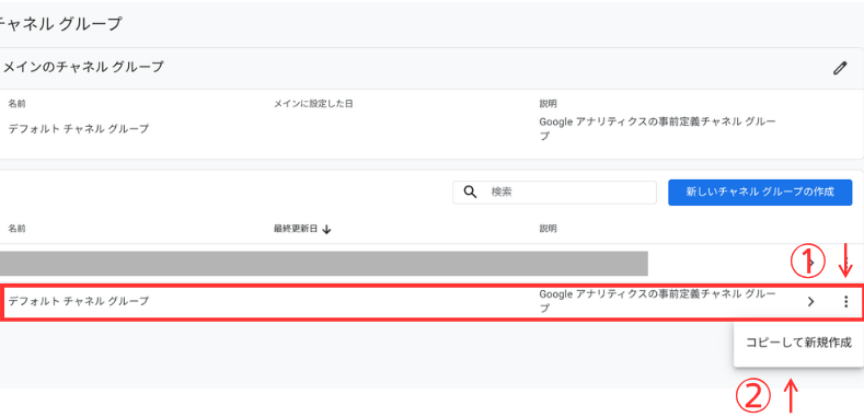 次に、「デフォルト チャネル グループ」が表示されているので、右端の「︙(三点メニュー)」をクリックし、「コピーして新規作成」を選択します。