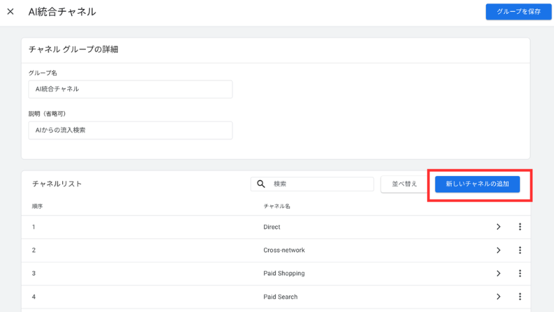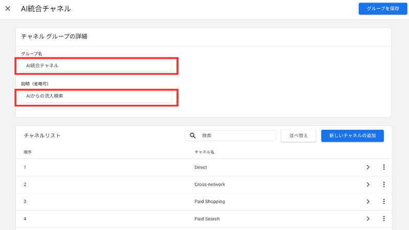 コピーが作成されたら、グループ名を「AI分析チャネル」など分かりやすい名前に変更します。説明欄も「AIからの流入を分析するため」などと入力しておくと、後から見返したときに分かりやすくなります。