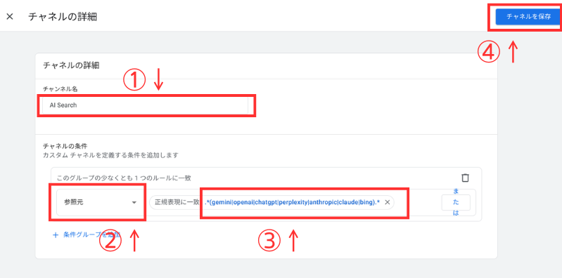 ② チャネルの条件を「セッションの参照元」→「正規表現に一致」に設定