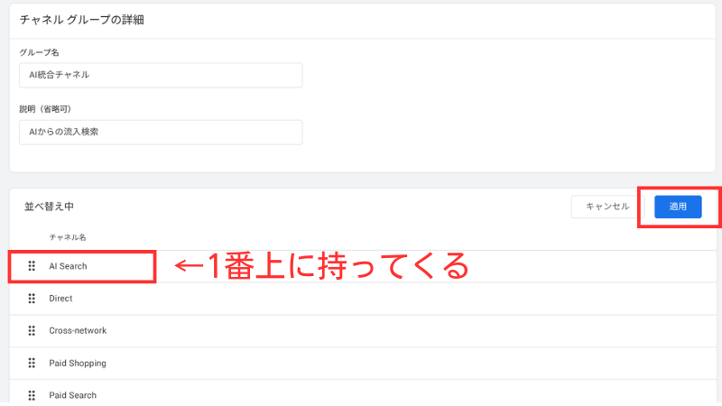 作成した「AI Search」を一番上にドラッグして移動し、「適用」をクリックします。